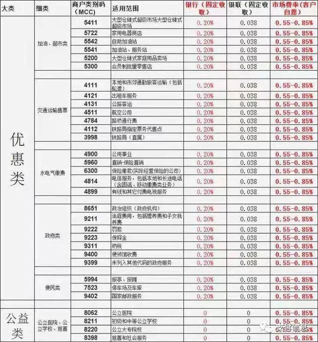 有的機(jī)器前五分鐘刷卡在北京,五分鐘之后刷卡在西安,這是不合理的。商戶類別碼顯示的是刷卡費(fèi)率,如果你刷的都是優(yōu)惠類及公益類,銀行是不賺錢的,對用卡人來講,是不利于用卡提額的。以下是部分費(fèi)率表,可以對應(yīng)查詢刷卡費(fèi)率是多少。
