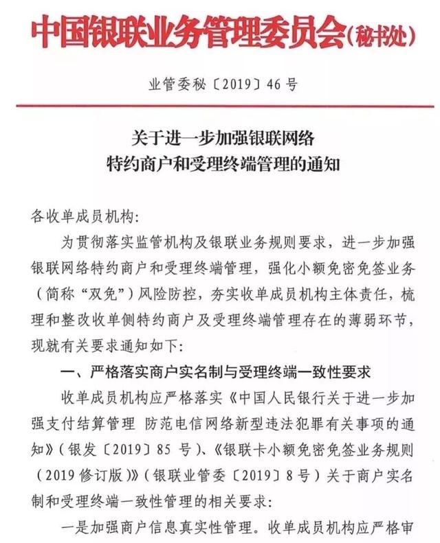 今日起,關(guān)閉所有大pos平臺(tái)的小額雙免交易,真實(shí)執(zhí)照進(jìn)件的商戶不受影響。如用戶在我司傳統(tǒng)POS終端使用云閃付小額雙免時(shí)提示:響應(yīng)碼40 ,請讓商戶進(jìn)行刷卡或插卡交易。此前,銀聯(lián)曾發(fā)布《關(guān)于進(jìn)一步加強(qiáng)銀聯(lián)網(wǎng)絡(luò)特約商戶和受理終端管理的通知》,要求收單成員機(jī)構(gòu)應(yīng)嚴(yán)格審核商戶資料,采取有效措施核實(shí)商戶經(jīng)營真實(shí)性與合法性。按照“應(yīng)注冊、盡注冊”原則,在銀聯(lián)商戶平臺(tái)準(zhǔn)確填報(bào)相關(guān)商戶信息,做好注冊登記工作。收單成員機(jī)構(gòu)應(yīng)落實(shí)《關(guān)于加強(qiáng)小額免密免簽商戶注冊登記的通知》要求,對小額雙免商戶注冊登記情況進(jìn)行排查,并按計(jì)劃進(jìn)行補(bǔ)注冊工作。 《通知》稱10月下旬左右啟用雙免交易白名單核驗(yàn)功能。重申為了防范網(wǎng)上買賣POS機(jī)、刷卡器等受理終端,加強(qiáng)外包機(jī)構(gòu)管理,嚴(yán)禁外包機(jī)構(gòu)利用網(wǎng)絡(luò)渠道售賣受理終端。