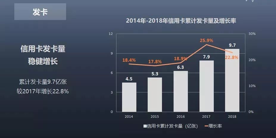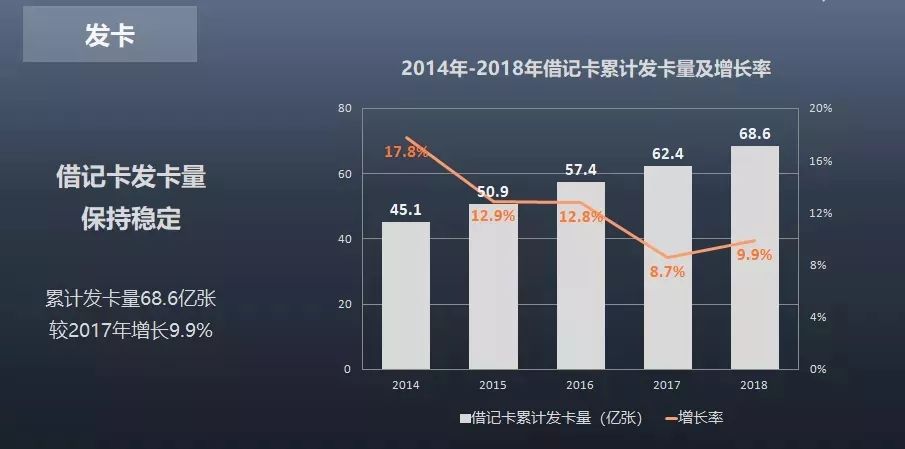 其中,信用卡累計(jì)發(fā)卡量為9.7億張,較2017 年底增長(zhǎng)22.8%,信用卡人均持卡量為0.7張;借記卡累計(jì)發(fā)卡量為68.6億張,較2017年底增長(zhǎng)9.9%,借記卡人均持卡量為4.92張。