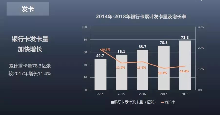 從發(fā)卡情況來(lái)看,截至2018年底,我國(guó)銀行卡累計(jì)發(fā)卡量為78.3億張。
